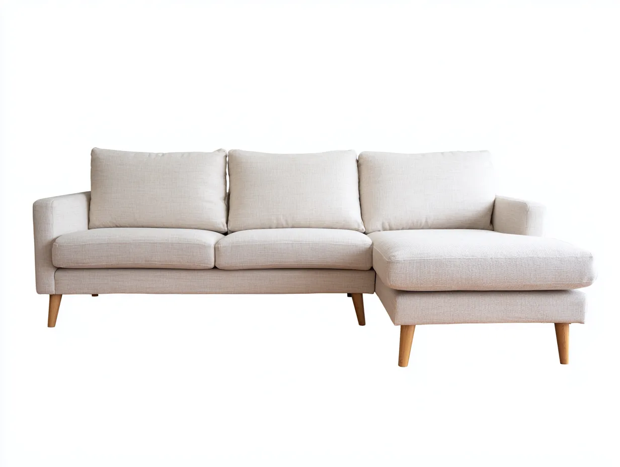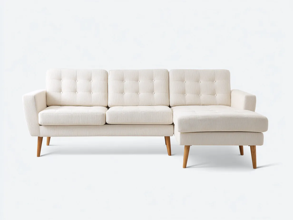 Sofá rinconero de tela marfil con respaldo capitoné y patas de madera 244 x 160 x 84 cm - para salón - estilo escandinavo y luminoso