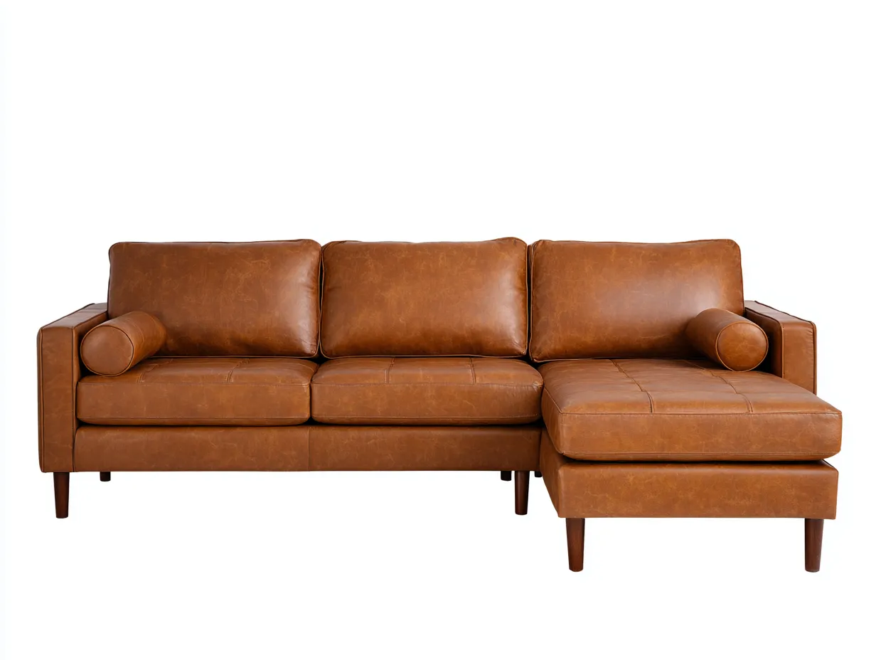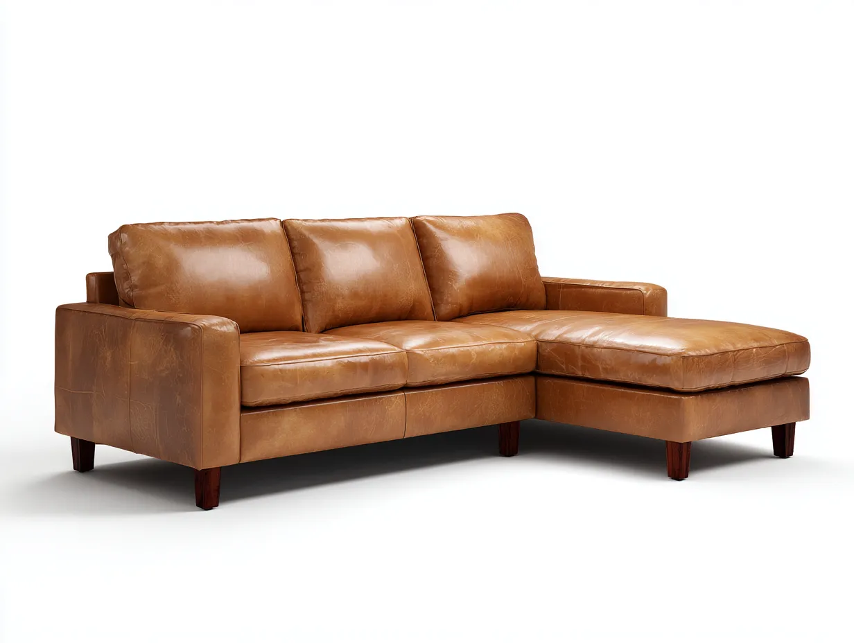 Sofá rinconero de cuero auténtico color camel con chaise longue y patas de madera oscura 248 x 155 x 84 cm - para salón - estilo contemporáneo y cálido