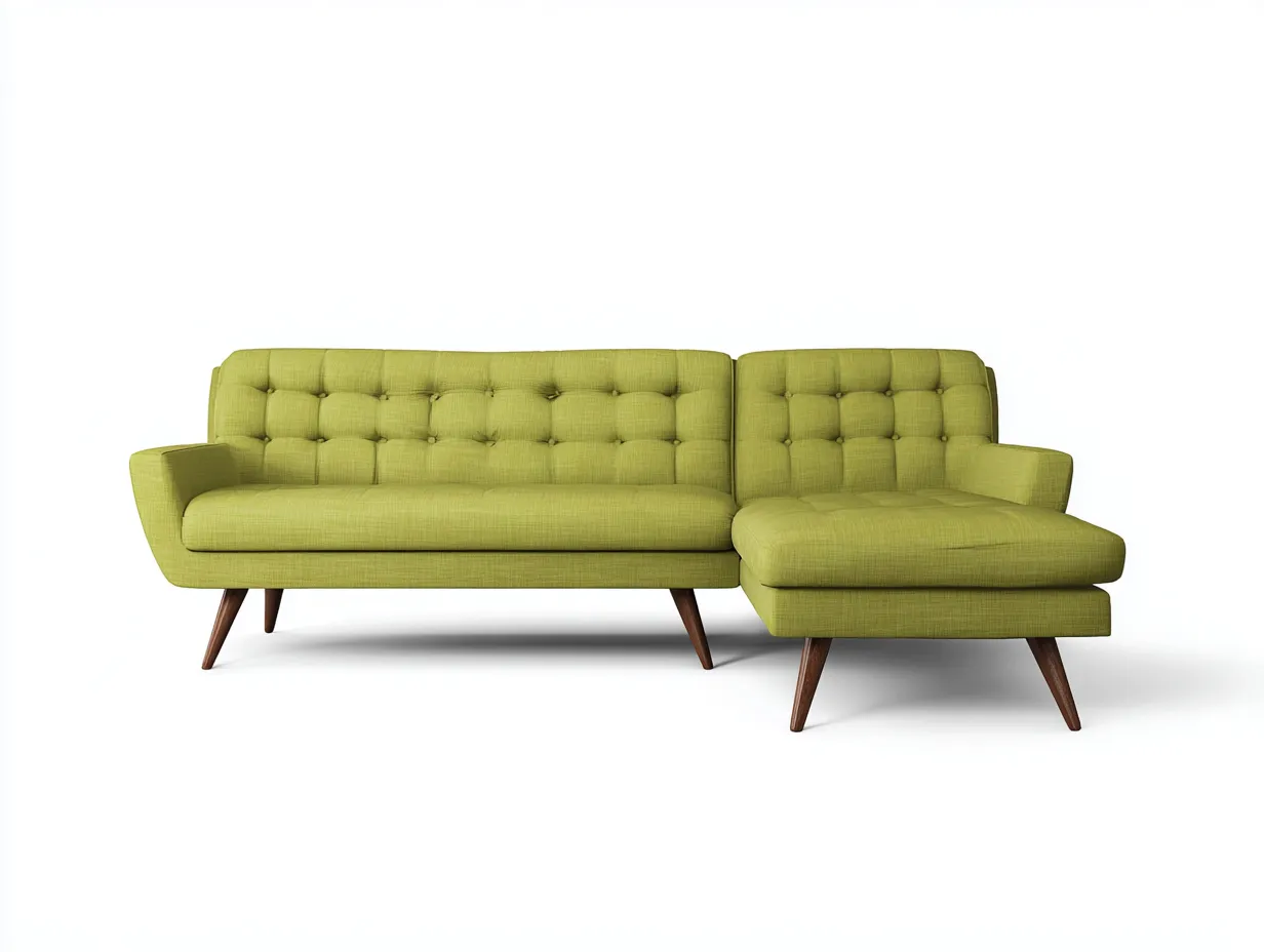 Sofá rinconero de tela verde lima con chaise longue y capitoné y patas de madera oscura 243 x 157 x 84 cm - para salón - estilo retro contemporáneo