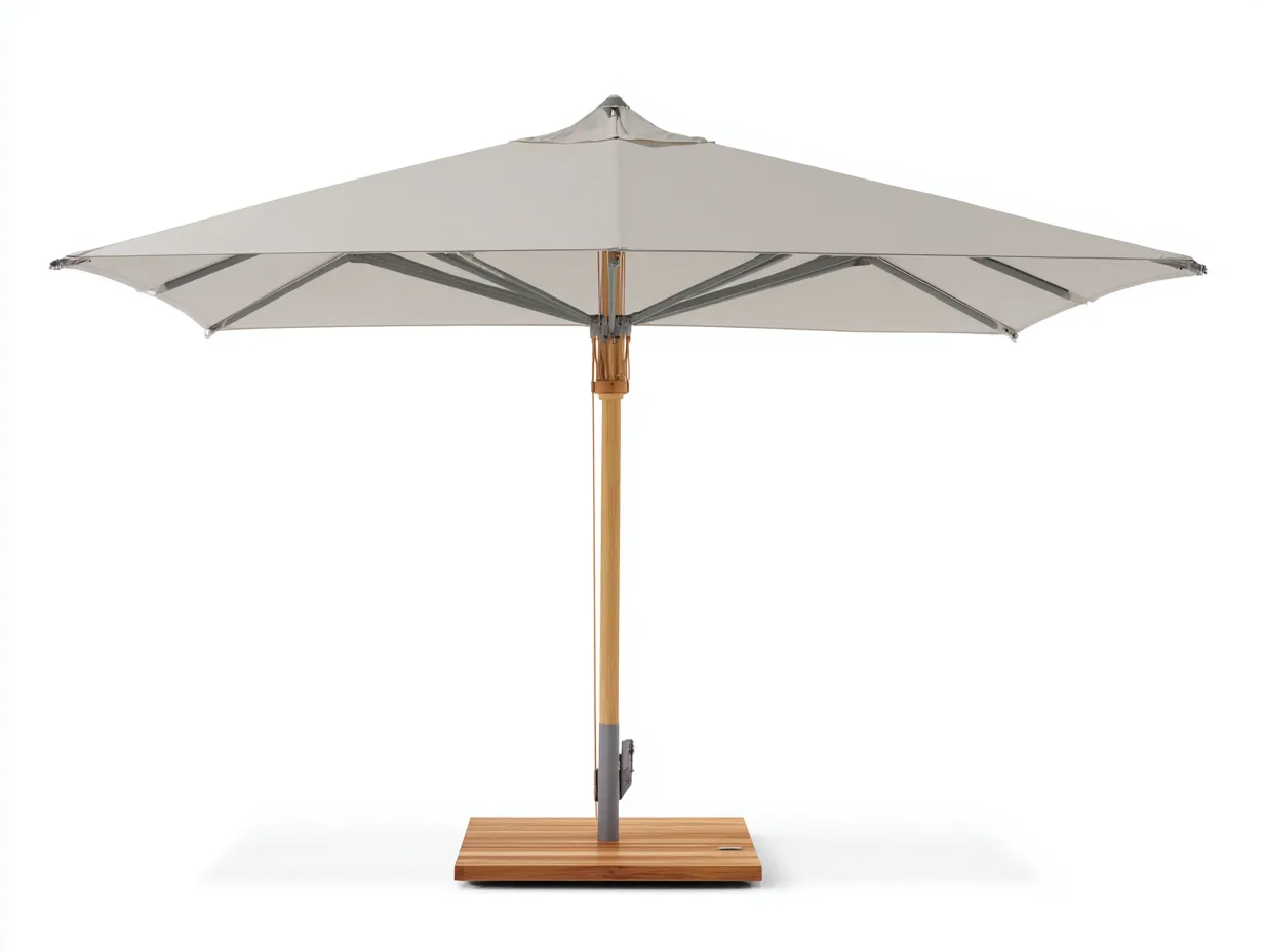 Sombrilla en tela y aluminio y madera 300 x 300 x 255 cm - blanco roto y madera natural y gris - para jardín y terraza - estilo actual con poste central y base cuadrada