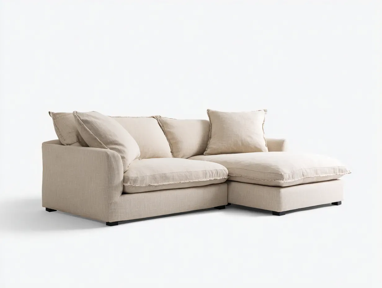 Este sofá rinconero de tela color crema con chaise longue aporta al salón una atmósfera luminosa, serena y muy acogedora. Su diseño combina volúmenes amplios, cojines generosos y líneas suaves que crean una sensación inmediata de confort, ideal para un espacio de descanso diario. La chaise longue amplía la superficie útil del asiento y permite una postura más libre para leer, descansar o compartir momentos de relax. Gracias a su aspecto desenfadado y a su presencia equilibrada, este modelo se integra con naturalidad en un salón contemporáneo, cálido y bien armonizado.