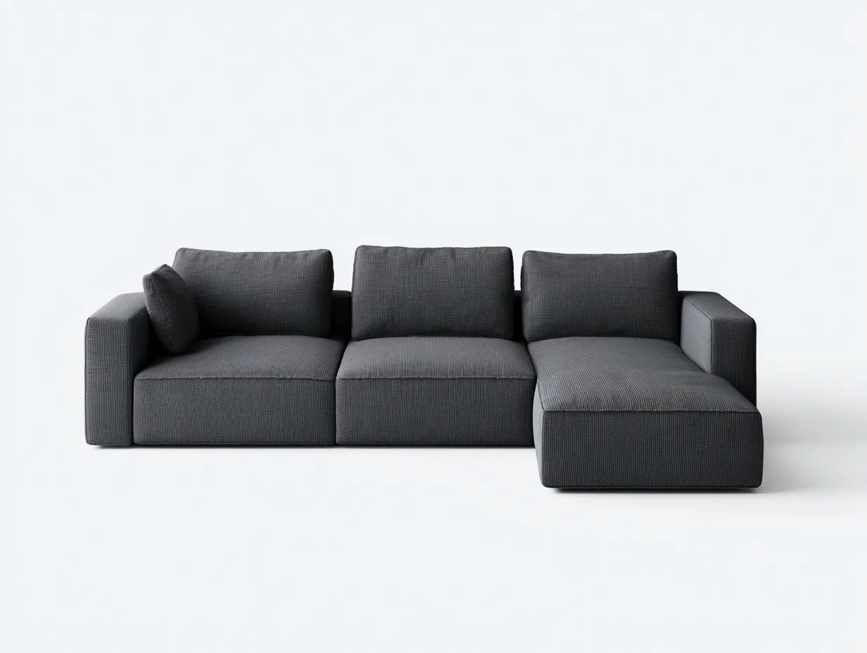Este sofá rinconero modular de tela gris antracita aporta al salón una imagen ordenada, contemporánea y muy versátil. Su composición de líneas rectas, grandes módulos de asiento y respaldos independientes crea una presencia visual estable, ideal para interiores actuales que buscan confort sin excesos decorativos. La chaise longue amplía la superficie útil y permite descansar con más libertad en el día a día. Gracias a su diseño amplio y bien proporcionado, este modelo se integra con naturalidad en un salón moderno, funcional y cómodo.