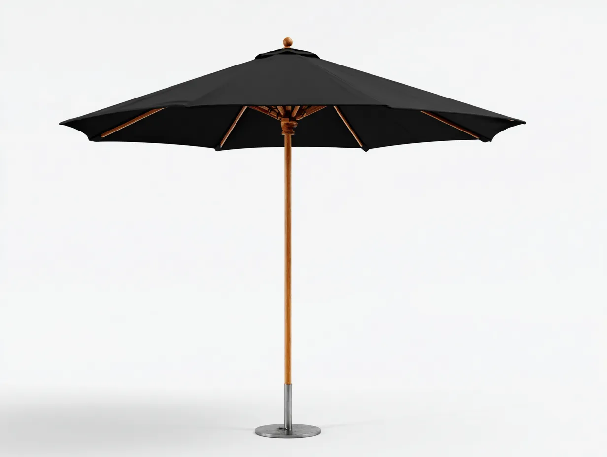 La sombrilla combina una cubierta textil en negro con un poste en acabado madera natural y una base circular metálica en tono gris plata, pensados para un uso exterior habitual. Las varillas interiores ayudan a sostener la cubierta de forma uniforme y refuerzan la estabilidad visual del conjunto. La mezcla de negro intenso, madera cálida y metal claro aporta una imagen refinada, moderna y fácil de integrar en composiciones exteriores de estilo actual.