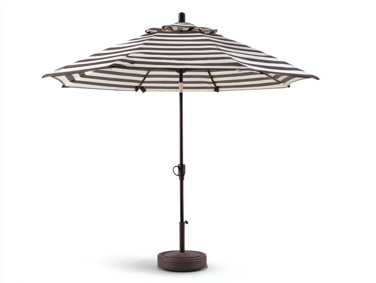La sombrilla combina una cubierta textil a rayas en crema y marrón chocolate con una estructura metálica en tono oscuro y una base redonda a juego, pensadas para un uso exterior habitual. Las varillas interiores ayudan a sostener la cubierta con una apertura uniforme y visualmente ordenada. La combinación cromática entre la tela rayada y la estructura oscura aporta una apariencia sobria, decorativa y fácil de integrar en ambientes exteriores elegantes.