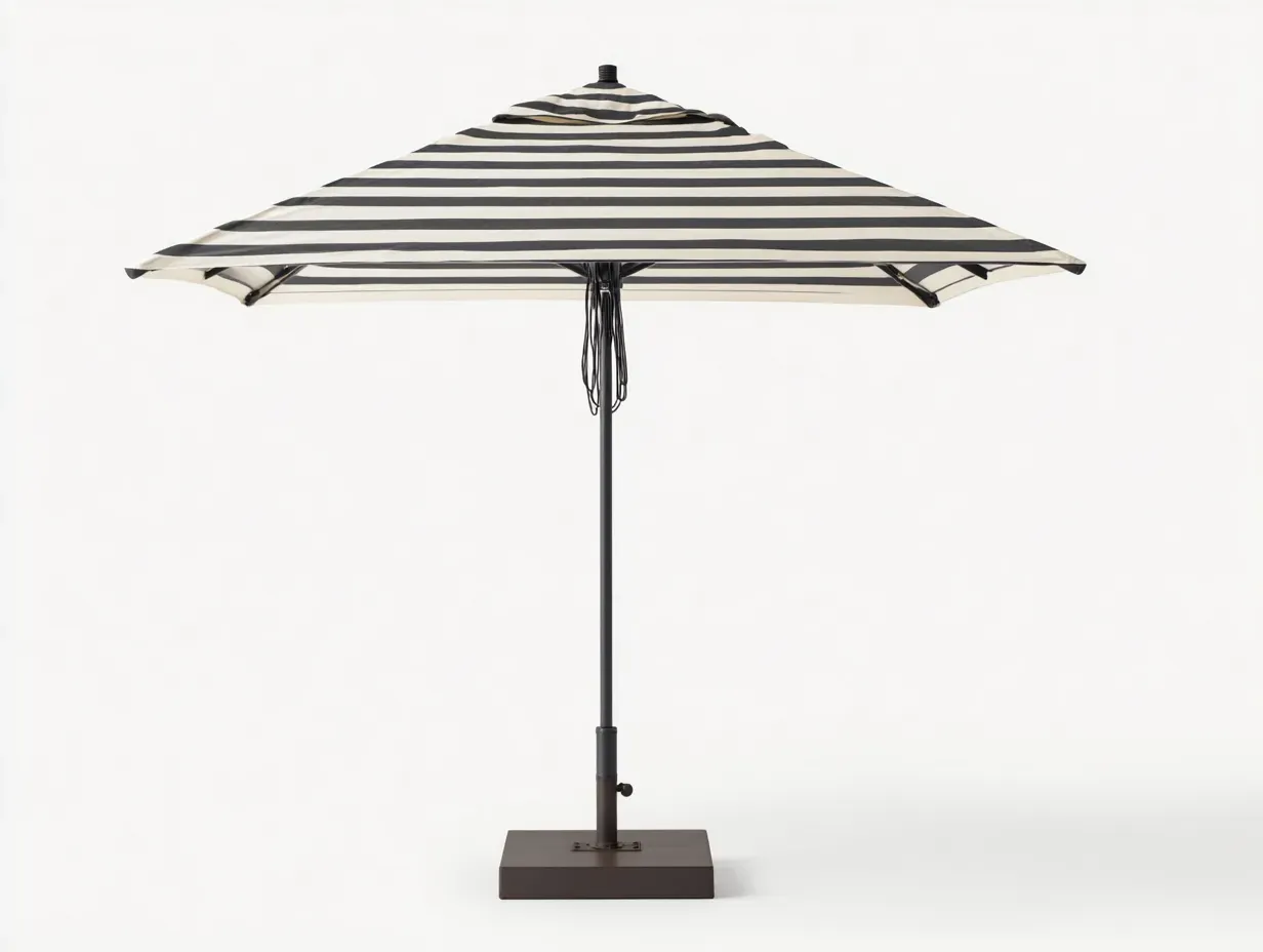 La sombrilla combina una cubierta textil con estampado de rayas en blanco roto y negro con una estructura metálica en tono oscuro y una base cuadrada en marrón oscuro, pensadas para un uso exterior habitual. Las varillas interiores ayudan a mantener una apertura uniforme y bien definida de la cubierta. El contraste entre el textil a rayas y la estructura sobria refuerza su estilo contemporáneo y su presencia visual en jardín o terraza.