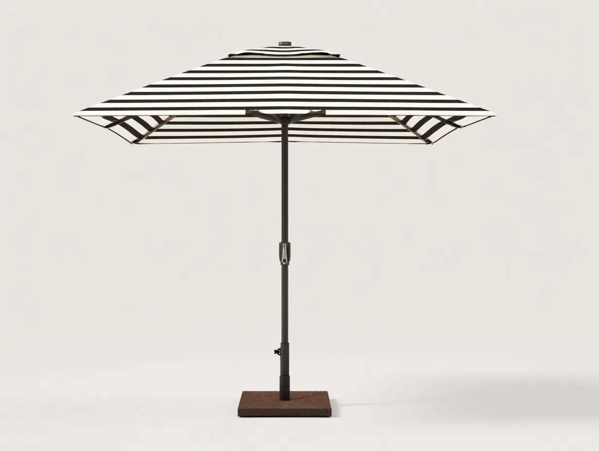La sombrilla combina una cubierta textil a rayas en blanco roto y negro con una estructura metálica en tono oscuro y una base cuadrada con acabado marrón nogal. Las varillas interiores sostienen la apertura de forma uniforme y contribuyen a un perfil limpio una vez desplegada. El contraste entre el estampado lineal y la estructura sobria refuerza una estética actual, adecuada para composiciones exteriores con personalidad visual.