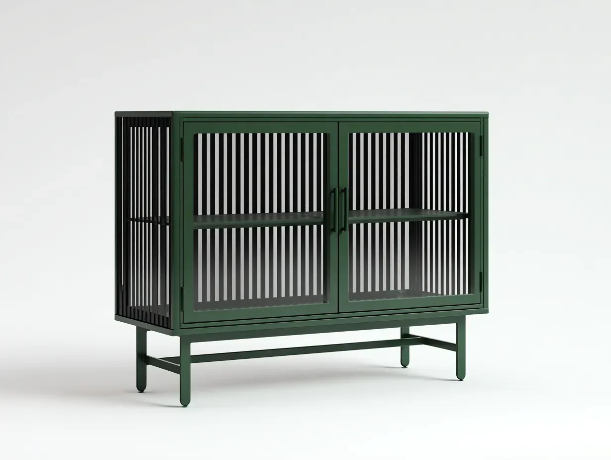 Fabricado en madera con acabado uniforme en color verde oscuro, el mueble incorpora paneles laterales y frontales con diseño de barrotes verticales. Esta estructura permite una ventilación adecuada del interior y aporta un carácter distintivo. La base elevada con refuerzo inferior mejora la estabilidad general. El acabado mate contribuye a una apariencia discreta y fácil de integrar en distintos estilos de interior.