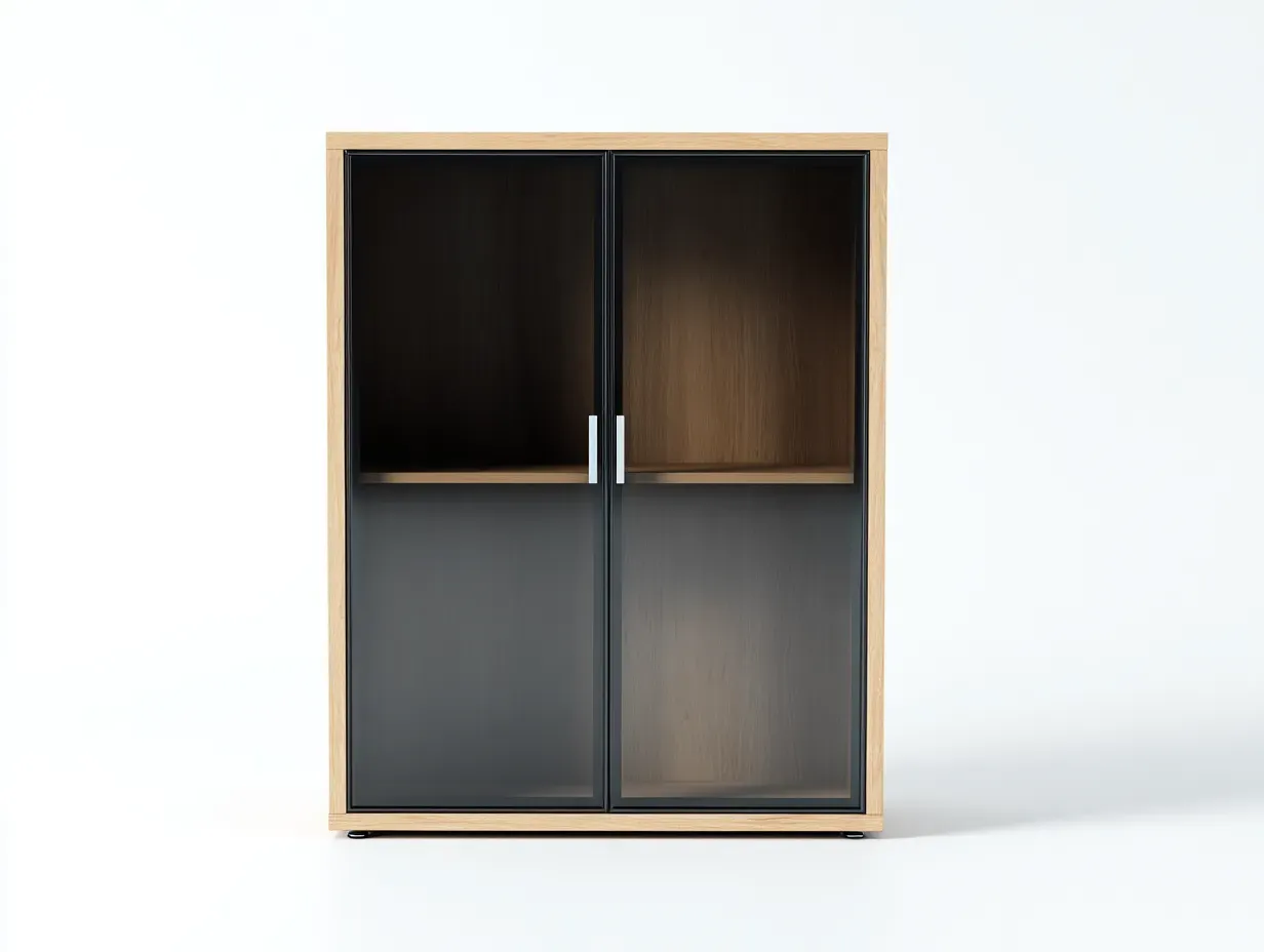 Fabricada en paneles de madera con acabado tipo roble, esta vitrina ofrece una superficie visualmente cálida y fácil de combinar. Las puertas con vidrio ahumado negro y tiradores discretos completan el conjunto con una presencia moderna, mientras que la estructura estable proporciona una buena base para un uso cotidiano en interiores.