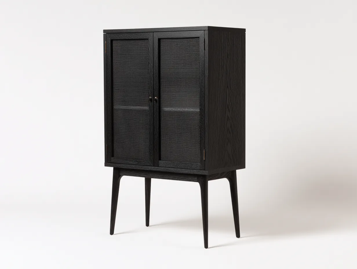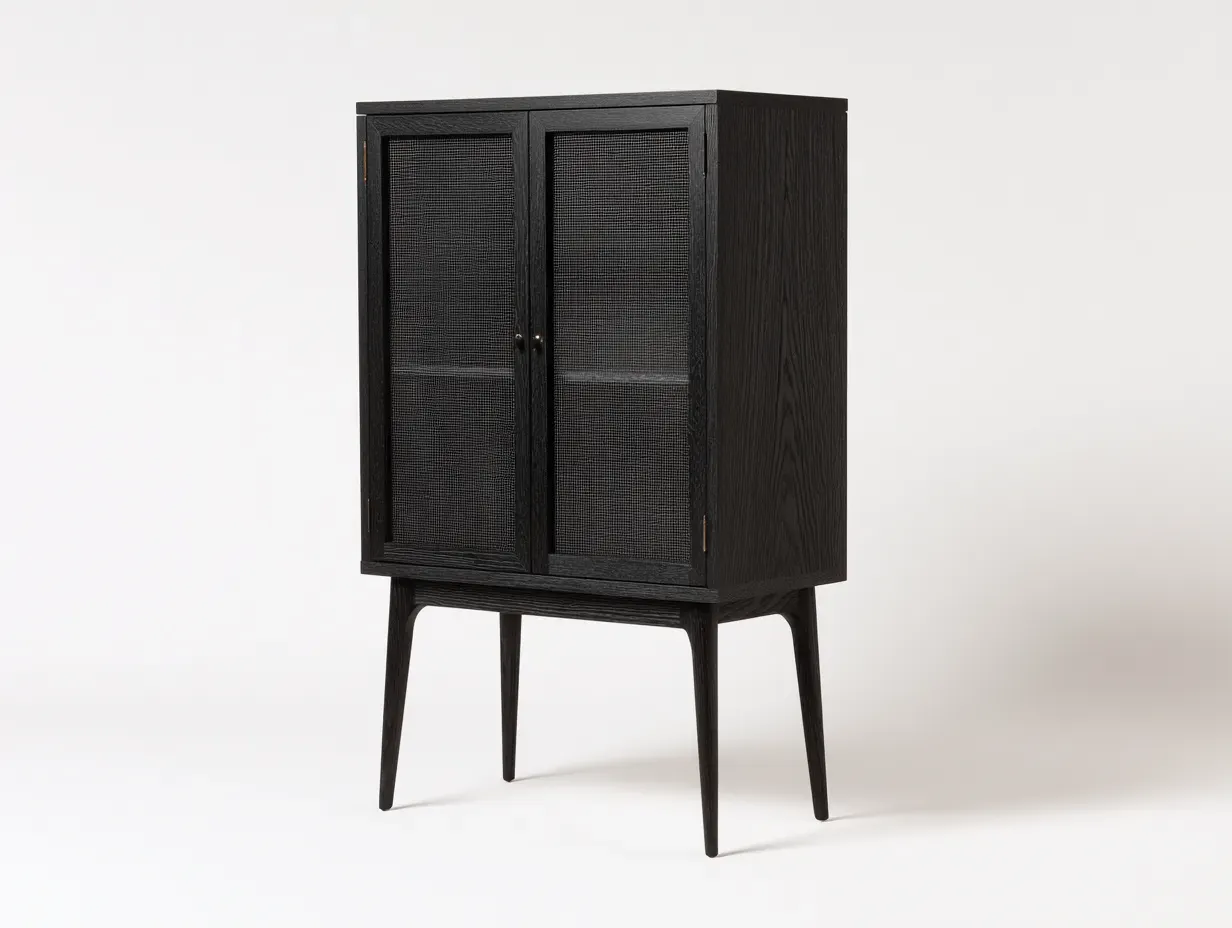 Esta vitrina está fabricada en madera con acabado negro, con una estructura estable y una superficie de textura llamativa. Las puertas de vidrio texturizado, los estantes interiores y los tiradores ocultos crean en conjunto una estética sencilla y práctica, adecuada para el uso diario.