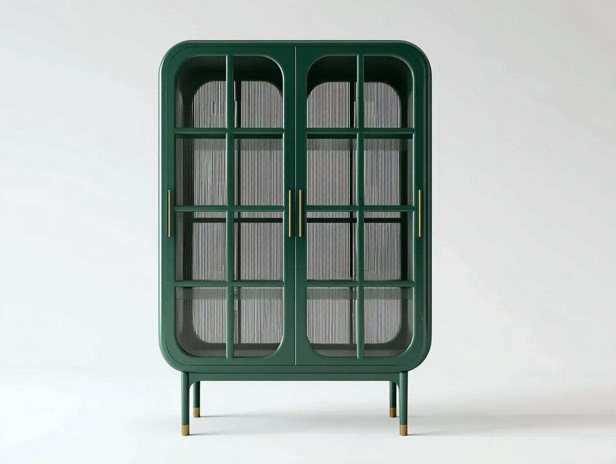 Esta vitrina de madera verde oscuro aporta al salón una imagen elegante, original y muy bien definida. Su diseño combina una silueta redondeada, puertas acristaladas con división geométrica y un acabado profundo que realza el carácter decorativo del mueble sin perder funcionalidad. Los paneles de vidrio permiten organizar y mostrar vajilla, libros o piezas decorativas de manera más cuidada, manteniendo al mismo tiempo una sensación visual ligera. Gracias a su formato vertical y a su presencia refinada, esta vitrina encaja muy bien en interiores contemporáneos, elegantes o de inspiración nórdica actual.